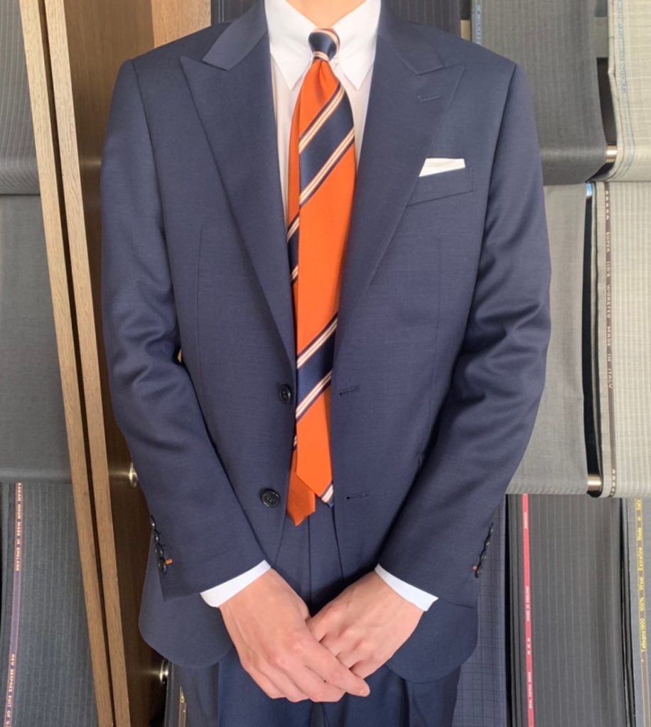 シックなネイビーの生地に、ネクタイでアクセントをつける。