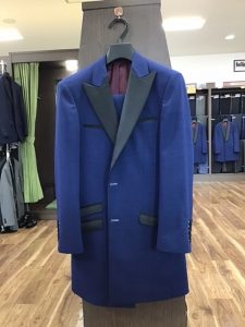 ブルーのメッシュ素材ストレッチ生地を使用して、リードギター担当の増井氏とウッドベース担当の大畑氏はショールカラー、ギターボーカル担当の藤島氏とスタンディングドラムの工藤氏はピークラベルの衿にされております。