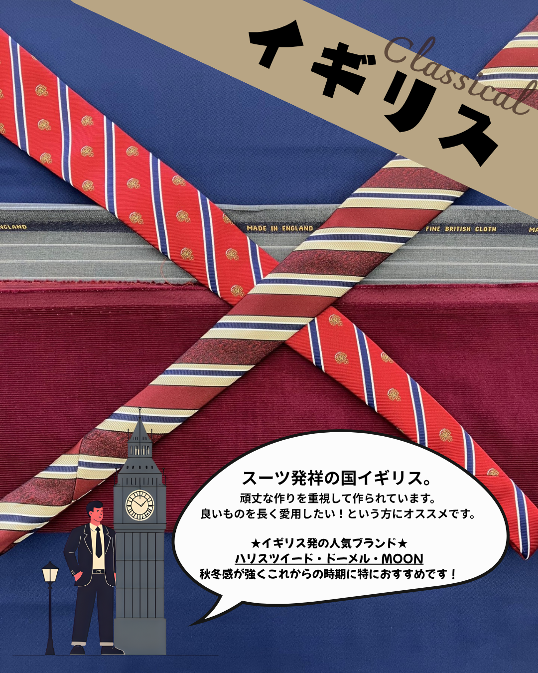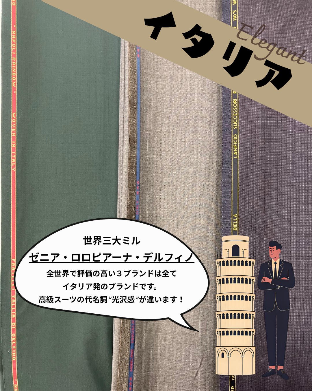 全体的に柔らかい生地が多く、ドレープ感があり発色が鮮やかで光沢感があるスーツを仕立てたいときにオススメです。