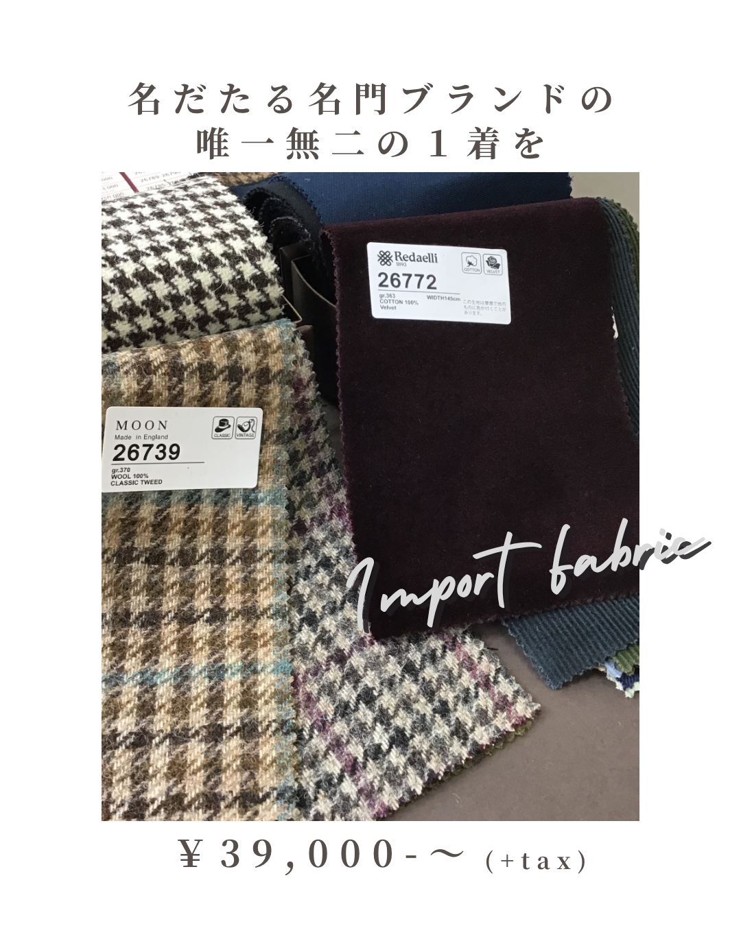 イタリアの名門マルラーネ、アンジェリコ イギリス秋冬生地の代表格ムーン、ジョン・フォスターなど名だたるブランド生地をご用意してます。